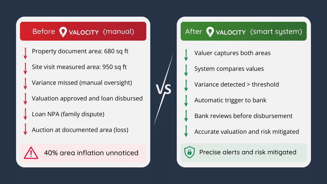 Valocity transforms property valuation from a manual, judgement-led process into a system-controlled safeguard. What once resulted in costly NPAs is now prevented through built-in intelligence, compliance checks, and automated risk controls, giving lenders confidence at every stage of the lending lifecycle.