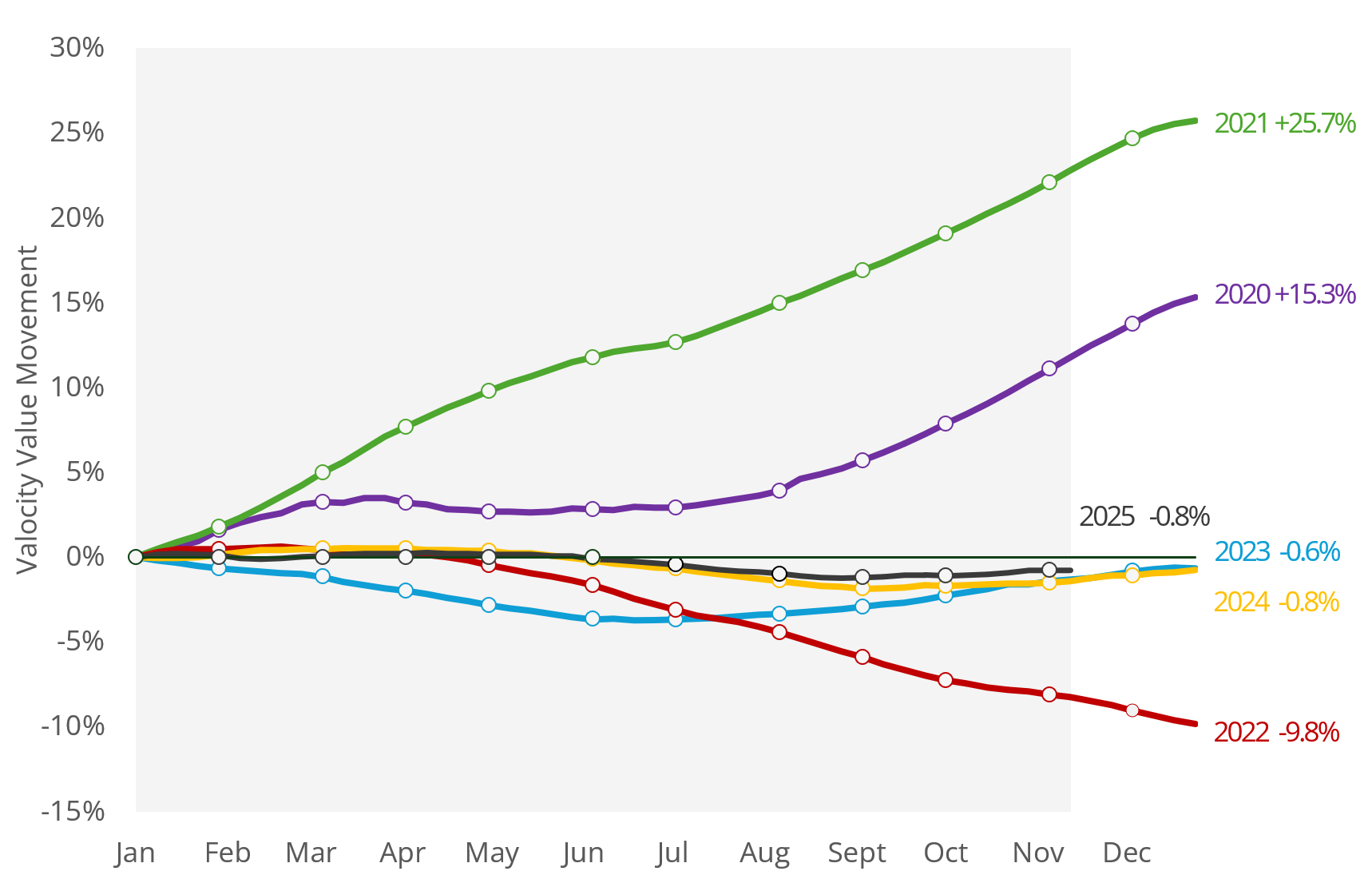 While 2024 was widely seen as a favourable environment for buyers – particularly first-home buyers benefiting from lower mortgage rates and reduced competition – broader economic uncertainty acted as a drag on market momentum. The Valocity Value Index has declined by 0.8% year-to-date and is on track to finish the year with a modest overall decrease.