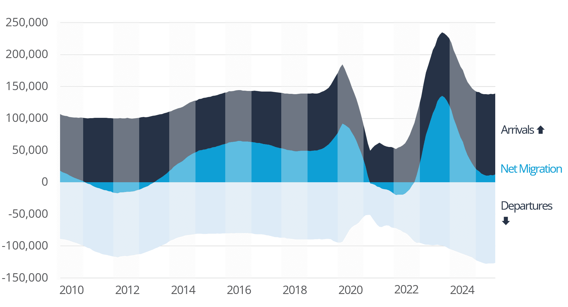 Net migration appears to have reached its low point, with the year ended September showing an improvement compared with August. However, a key concern over the past 12 months has been the high number of New Zealanders leaving the country, totalling 72,700 departures. Attractive opportunities abroad have been a major driver of this outflow, adding to overall migration pressures.